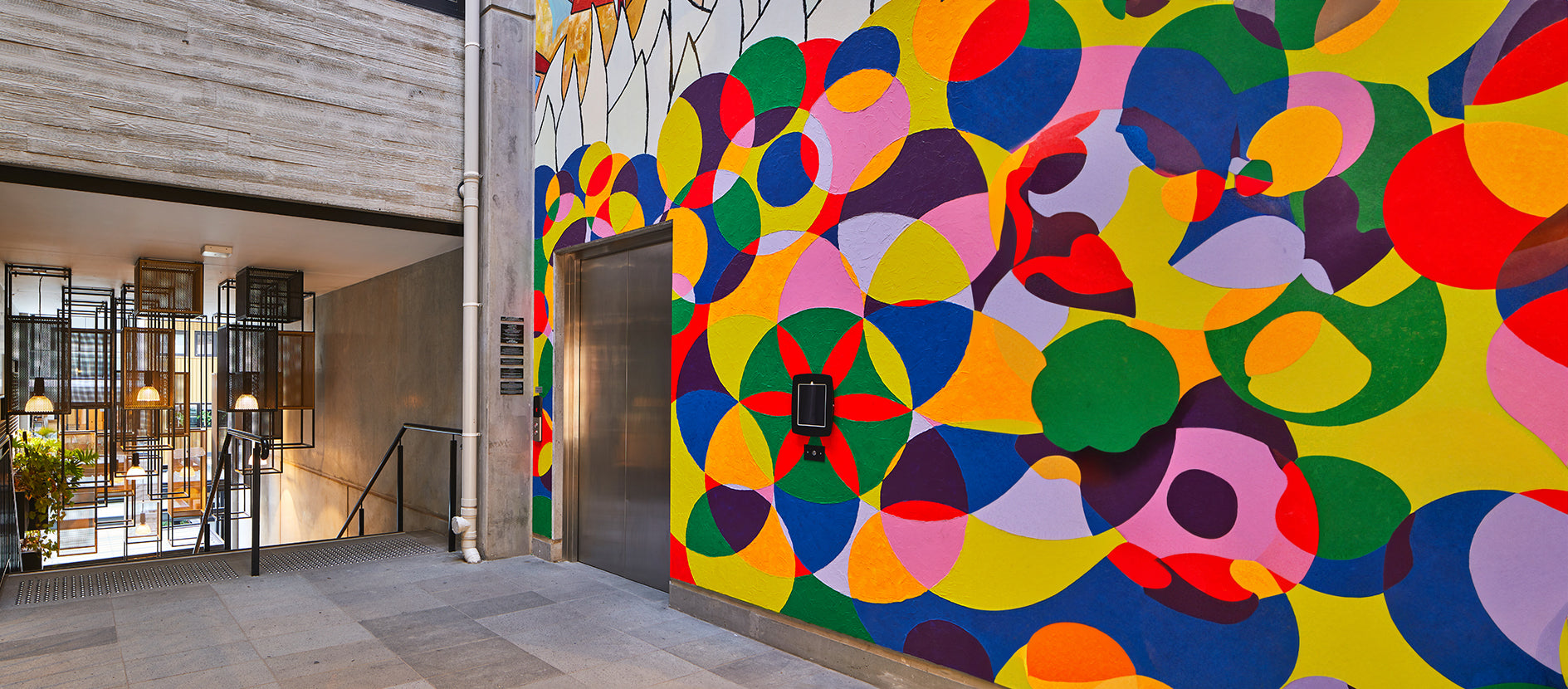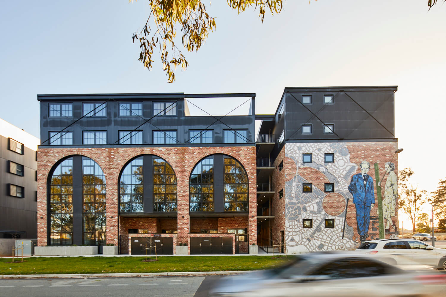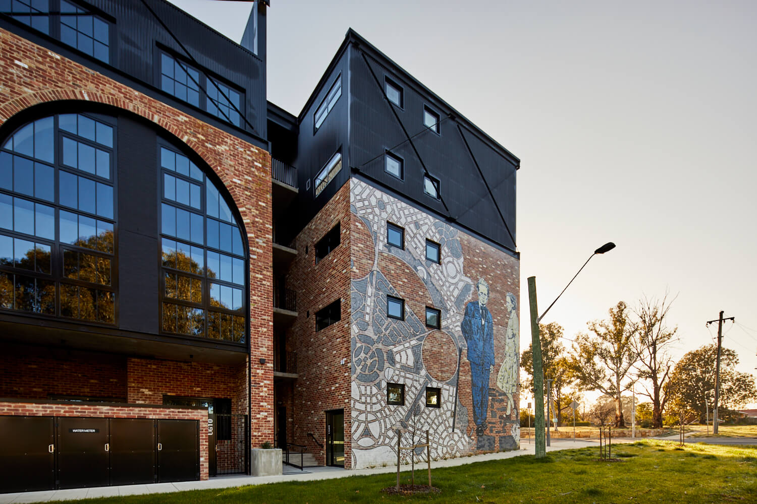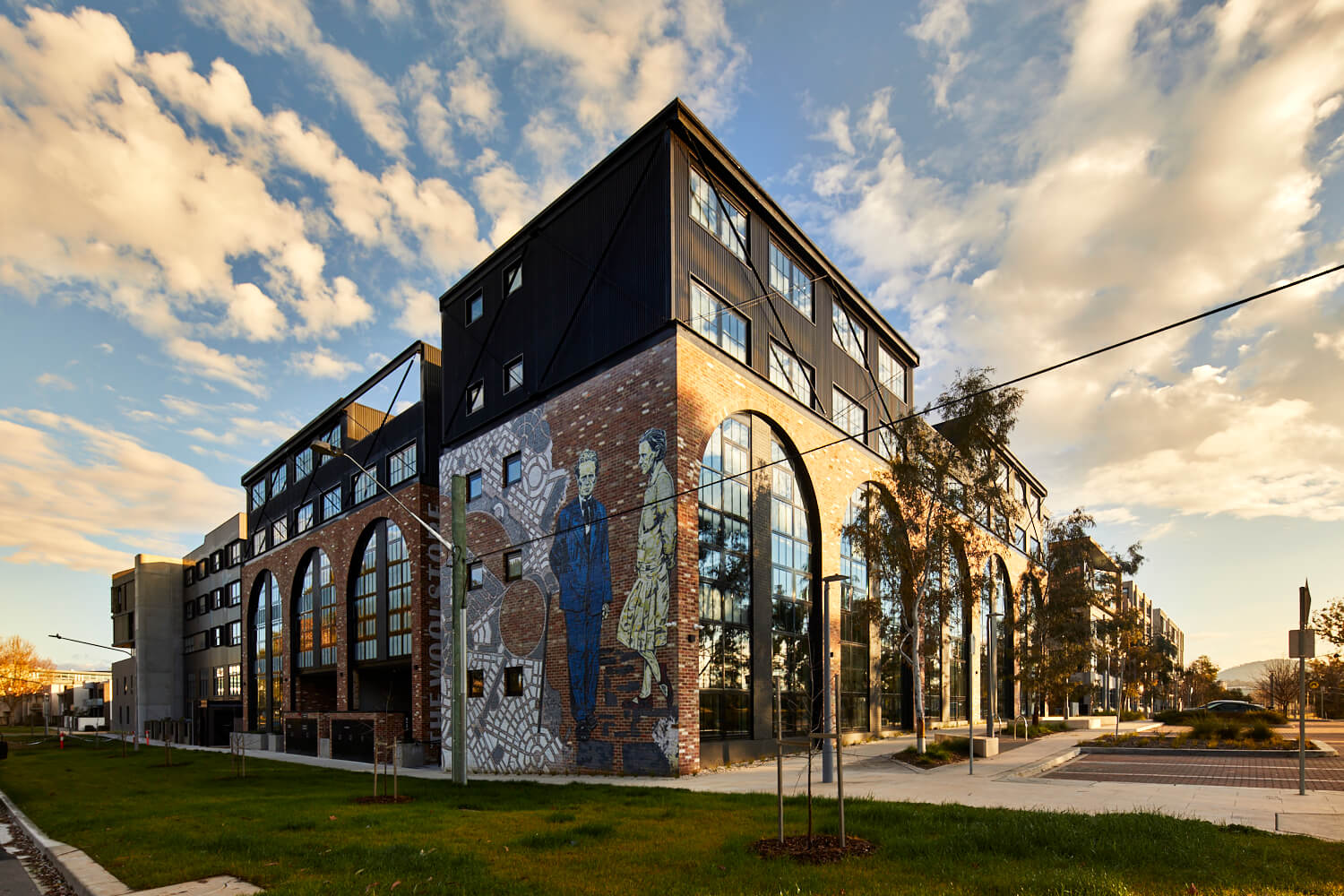This building known as the Woolstore is the final piece of the Kingsborough Village. The Village includes several commissioned art works and this large work was completed over the 2019/2020 summer in thick smoke haze and scorching temperatures between fires and hail storms and before Covid 19 arrived on our shores. The Woolstore was completed and began to be occupied in October 2020.